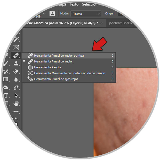 Ahora vamos a poder usar alguna de estas sencilla herramientas: Pincel corrector puntual y Pincel corrector