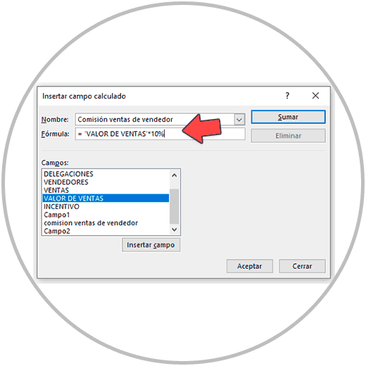 Y después haremos la operación. La comisión o incentivo que se lleva cada uno sería de un 10% sobre el valor de ventas. Eligiríamos en la lista de campos “VALOR DE VENTAS” seleccionando en el listado y dando al botón de “añadir campo” y multiplicaríamos como en la imagen abajo *10%.