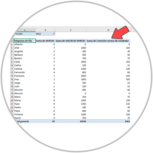 Ahora podemos añadir una nueva columna a nuestra tabla dinámica. Lo que queremos enseñaros es cómo se puede hacer una operación dentro de la tabla dinámica creando una columna nueva para calcular la comisión de cada vendedor que será del 10% sobre el valor de ventas de cada uno.
