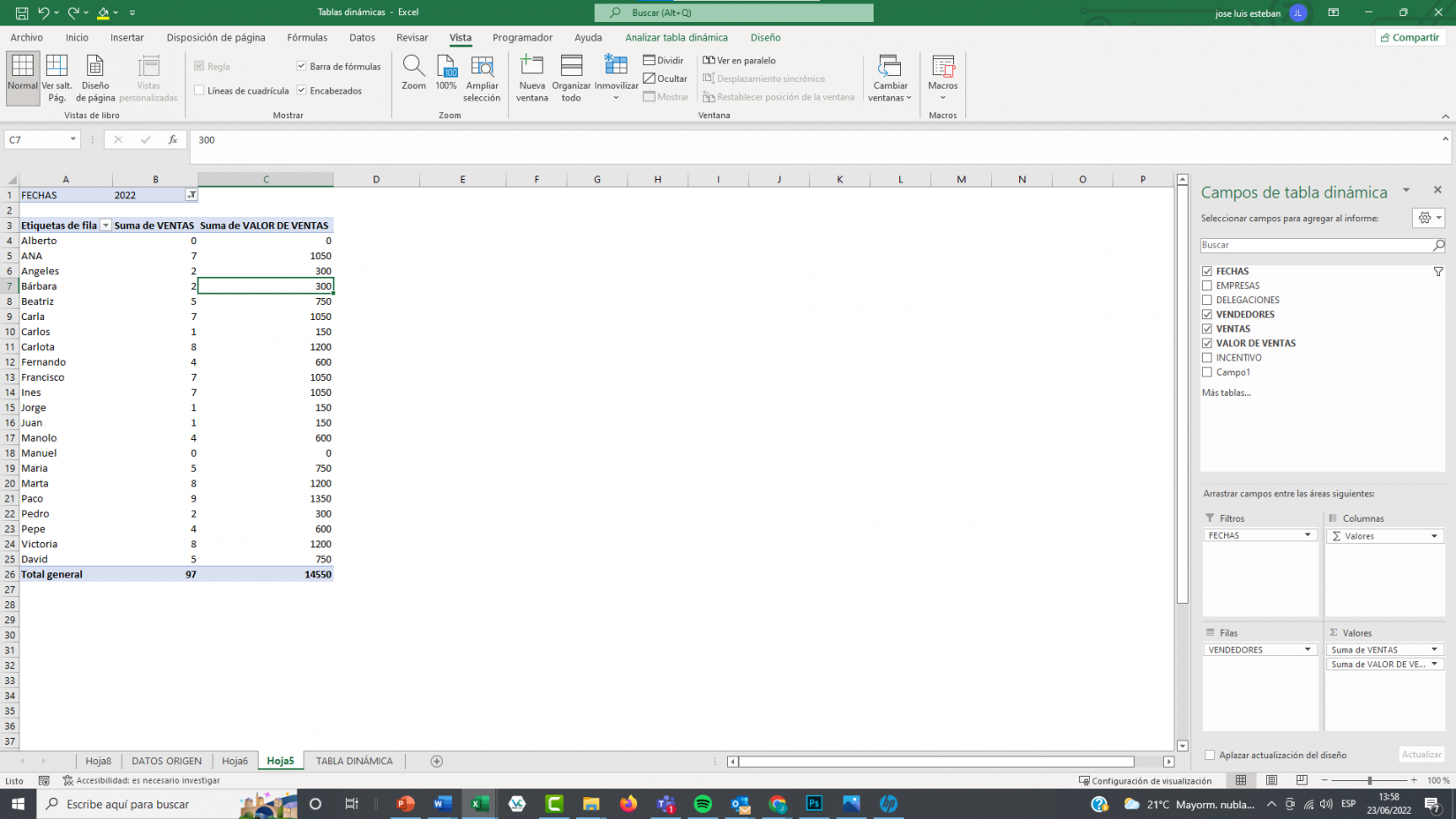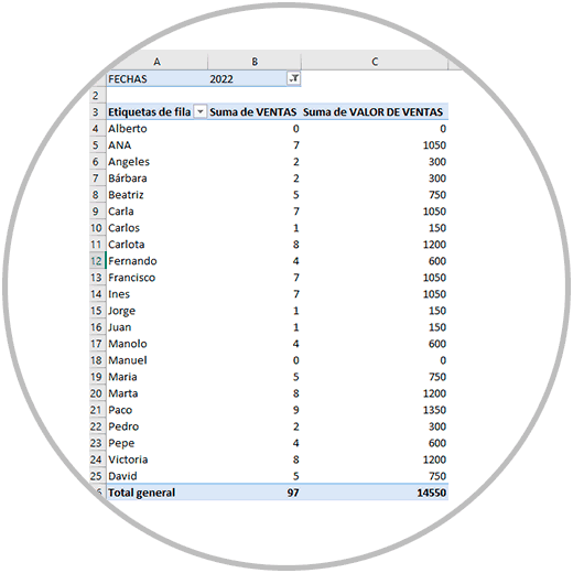 - En Valores la suma de las ventas y del valor de ventas