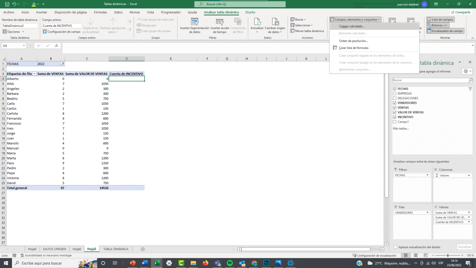 Pero, es más, puedes usar a partir de ahora esta operación que aparecerá como una opción más dentro del menú campos de tablas dinámicas. Siguiendo con nuestro ejemplo no hace falta que realices esta misma operación por ejemplo para ver el incentivo total a nivel de delegación o empresas, verás que, cambiando la configuración de la tabla dinámica, puedes añadir este nuevo campo calculado a cualquier tabla que realices a partir de ahora. Esta operación que has realizado si te das cuenta se ha creado como un campo de valor nuevo.