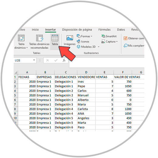 Ahora ya tienes tus datos convertidos en Tabla de Excel. Bien, ahora vamos a crear nuestra tabla dinámica. Nosotros vamos a crear una tabla de Excel sencilla donde vamos a ver los datos de ventas y del valor de las ventas a nivel de Empresas.