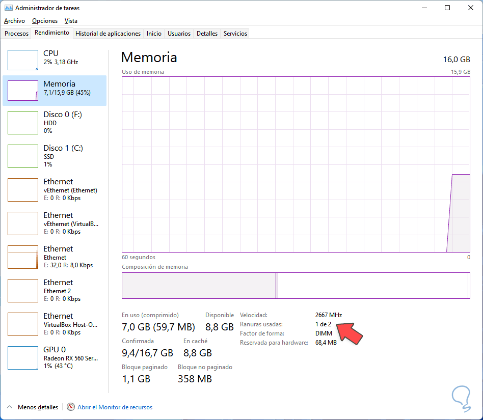 Vamos a la sección "Rendimiento", allí en "Memoria" observamos la línea "Ranuras usadas":
