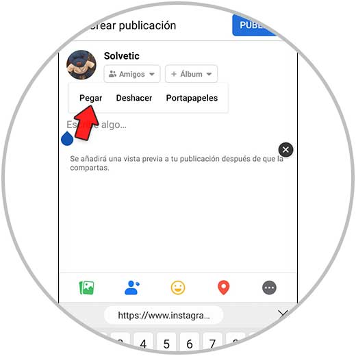Ahora entra en la App de Facebook y selecciona el sitio donde quieras copiar el enlace (muro, conversación de Messenger, grupo de Facebook, etc) Una vez hecho, mantén pulsado donde quieras pegar el enlace del Reel y selecciona “Pegar”.