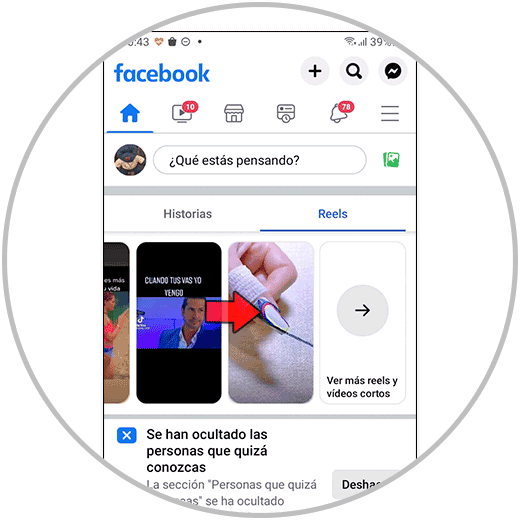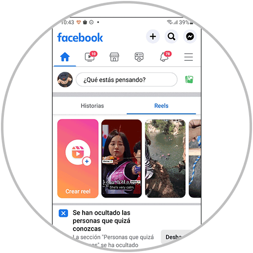 Dentro de la App de Facebook, nos situamos en el “Inicio”. Aquí vas a encontrar en la parte superior la opción de “Historias” y “Reels”. Pulsamos en la pestaña de “Reels”.