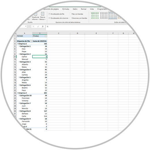 Como ejemplo, para que puedas ver esta función en la práctica, hemos creado una tabla dinámica con nuestro Excel ficticio donde representamos la información de las ventas de una compañía en niveles diferentes: A nivel de Empresa, delegación y también por vendedor.