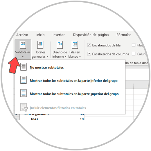 En el ejemplo abajo puedes ver cómo al hacer clic en esta tabla dinámica, podemos ya entrar en las opciones de “Diseño”. En este caso hacemos clic en “Subtotales”.