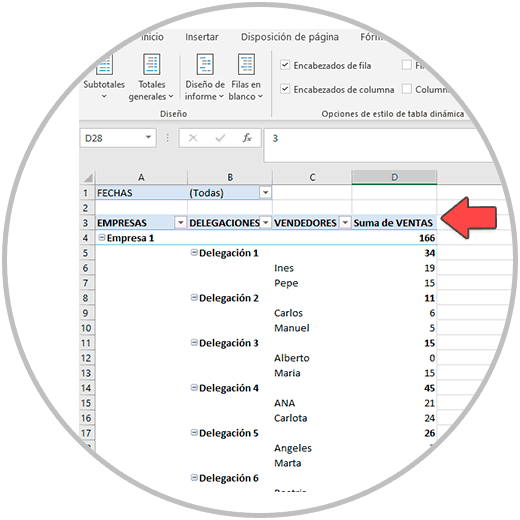 Opciones de Diseño de informe: Desde aquí podemos realizar algún cambio que facilite la lectura de la tabla. Si bien en nuestro ejemplo hemos elegido a la hora de configurar la tabla dinámica, la información de empresas, delegaciones y vendedores, desde “diseño de informe” vemos que la información está recogida todo bajo una misma columna desde donde podemos desplegar o contraer la información.