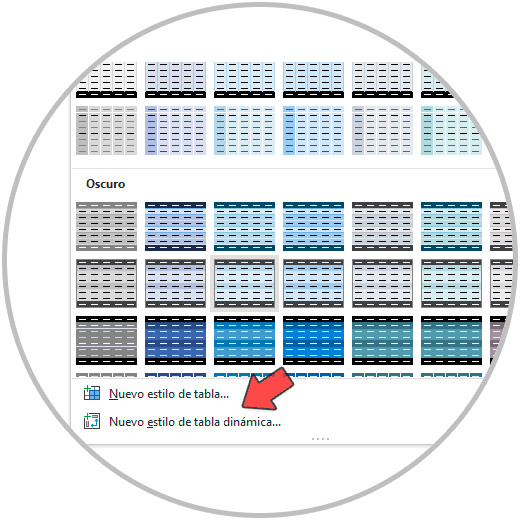 Al hacer clic en "Dar formato como tabla", se despliegan los estilos predefinidos de Excel. Nos tenemos que desplazar abajo del todo y hacer clic en "Nuevo estilo de tabla dinámica".