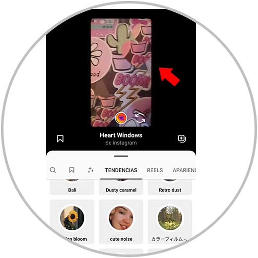 Aquí aparecerán los filtros en Tendencia. Pulsa sobre el que quieras probar y aparecerá el aspecto en la parte superior de la pantalla. Para utilizar ese filtro pulsa sobre la pantalla.