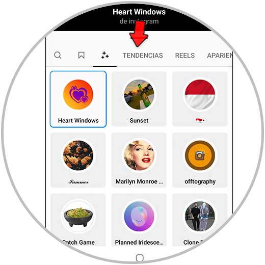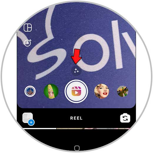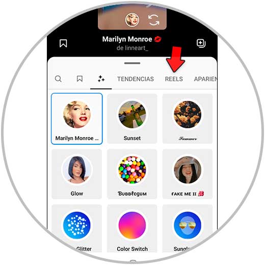En la parte superior, vas a ver los filtros divididos por categorías. Pulsa en “Reels” y pulsa sobre un efecto.