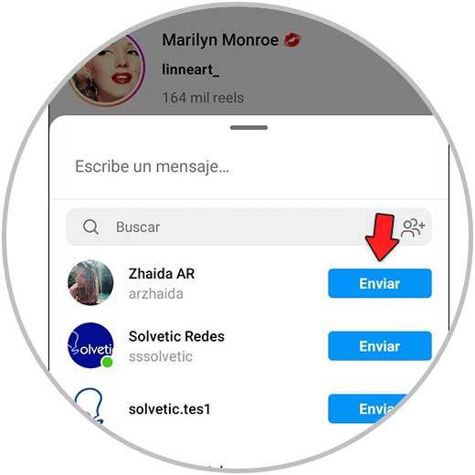 Por último, pulsa en “Enviar” junto al contacto con el que quieres compartir el filtro de Reels.