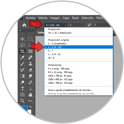 En la parte superior encontraremos un desplegable con las diferentes proporciones. Según lo que hemos visto antes elegiremos una en función de nuestra imagen