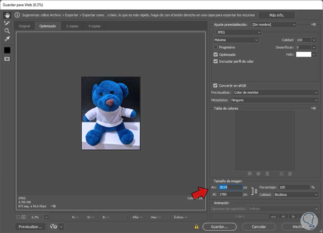 Aquí contaremos con diferentes opciones . Empezamos eligiendo el formato JPG en Calidad Máxima