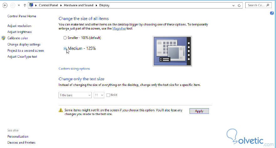 5- Una vez aquí debemos utilizar la opción cambiar de tamaño todos los items y elegimos la opción tamaño medio 125%, esto hará que se redimensione todo el escritorio, pero para que estos cambios surtan efecto, Windows nos va a pedir cerrar la sesión e iniciarla de nuevo, es por ello que debemos guardar todos nuestros trabajos abiertos en caso de tenerlos.