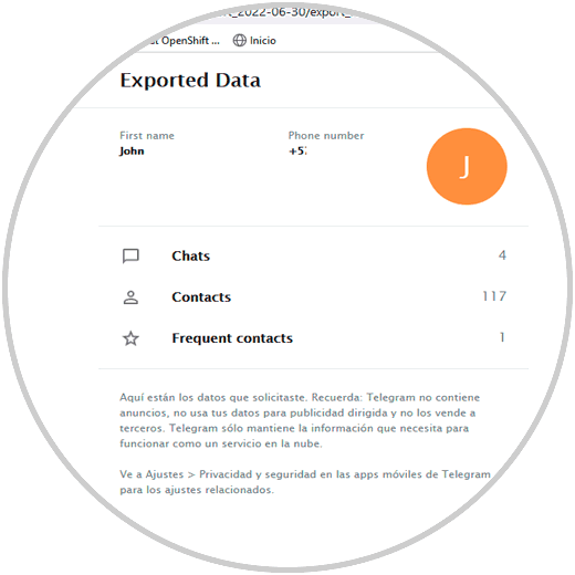 Abrimos el archivo HTML para ver los datos exportados de Telegram: