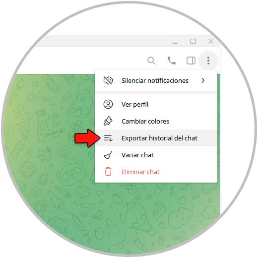 Luego pulsamos sobre el menú contextual y damos clic en "Exportar historial del chat":