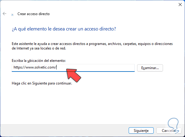 Copiamos la URL del sitio deseado y la pegamos en la ubicación del acceso directo: