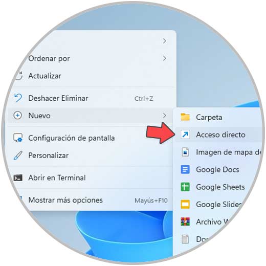 Este es el método popular para crear un acceso directo en Windows 11, para este proceso damos clic derecho en el escritorio y seleccionamos "Nuevo - Acceso directo":