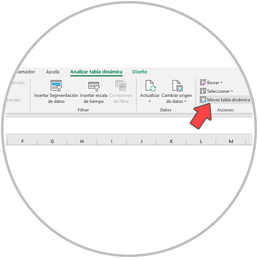 Ahora que ya hemos seleccionado la tabla, dentro de las opciones del menú ”Analizar tabla dinámica” buscamos la opción de mover tabla dinámica