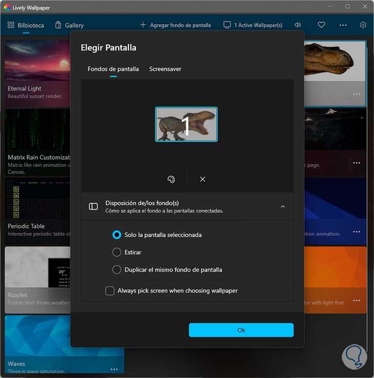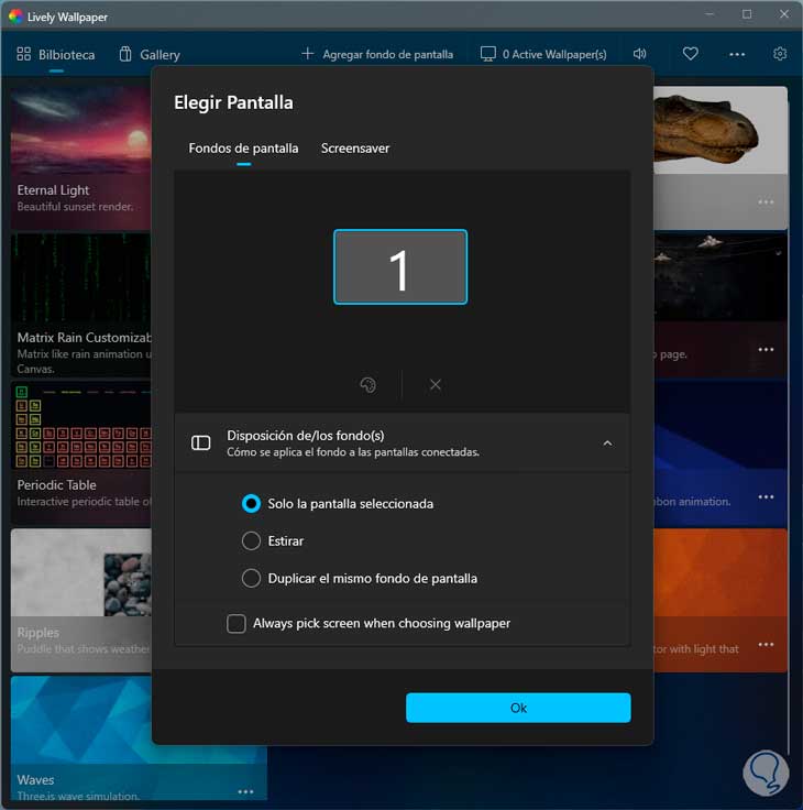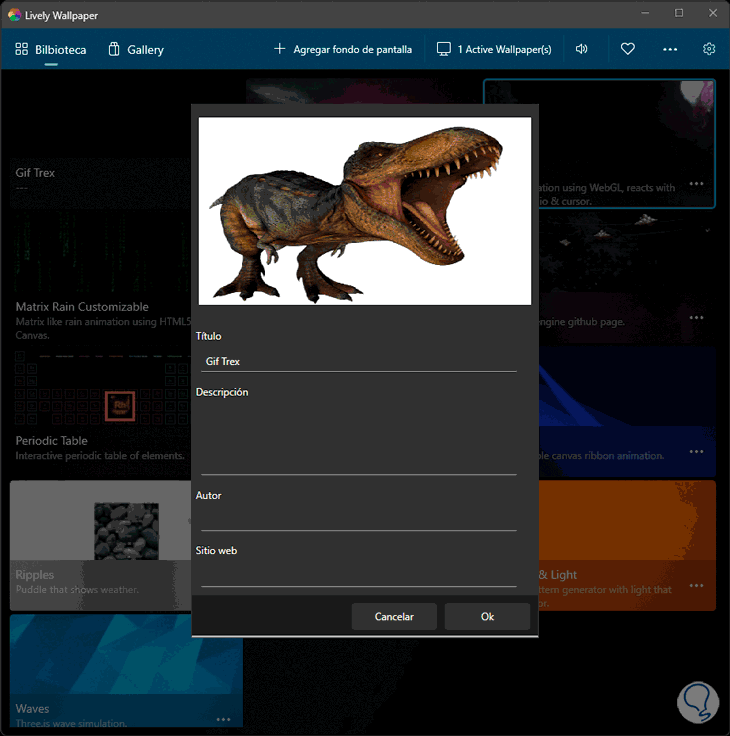 Allí podemos editar algunos parámetros de este, damos clic en OK y luego de editar sus valores se aplicará como fondo de pantalla en el sistema: