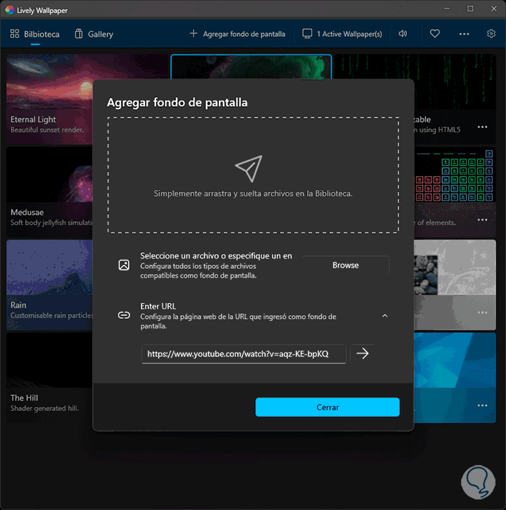 Es posible usar un archivo GIF o bien un enlace de YouTube para establecerlo como fondo de pantalla con movimiento en Windows 11, en este caso usaremos un GIF, damos clic en “Browse” para seleccionar el archivo GIF: