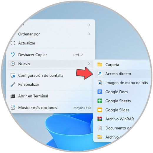 Luego, en el Escritorio de Windows 11 damos clic derecho y allí seleccionamos "Nuevo - Acceso directo":