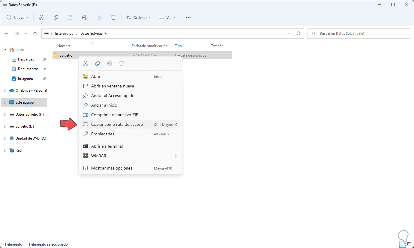 Para esto, abrimos el Explorador de archivos, damos clic derecho sobre la carpeta y seleccionamos la opción "Copiar como ruta de acceso":