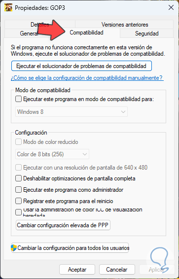 En la ventana emergente vamos a la pestaña "Compatibilidad":