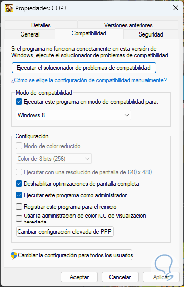 - Ejecutar programa en modo de compatibilidad para" y selecciona el sistema a usar como compatible
