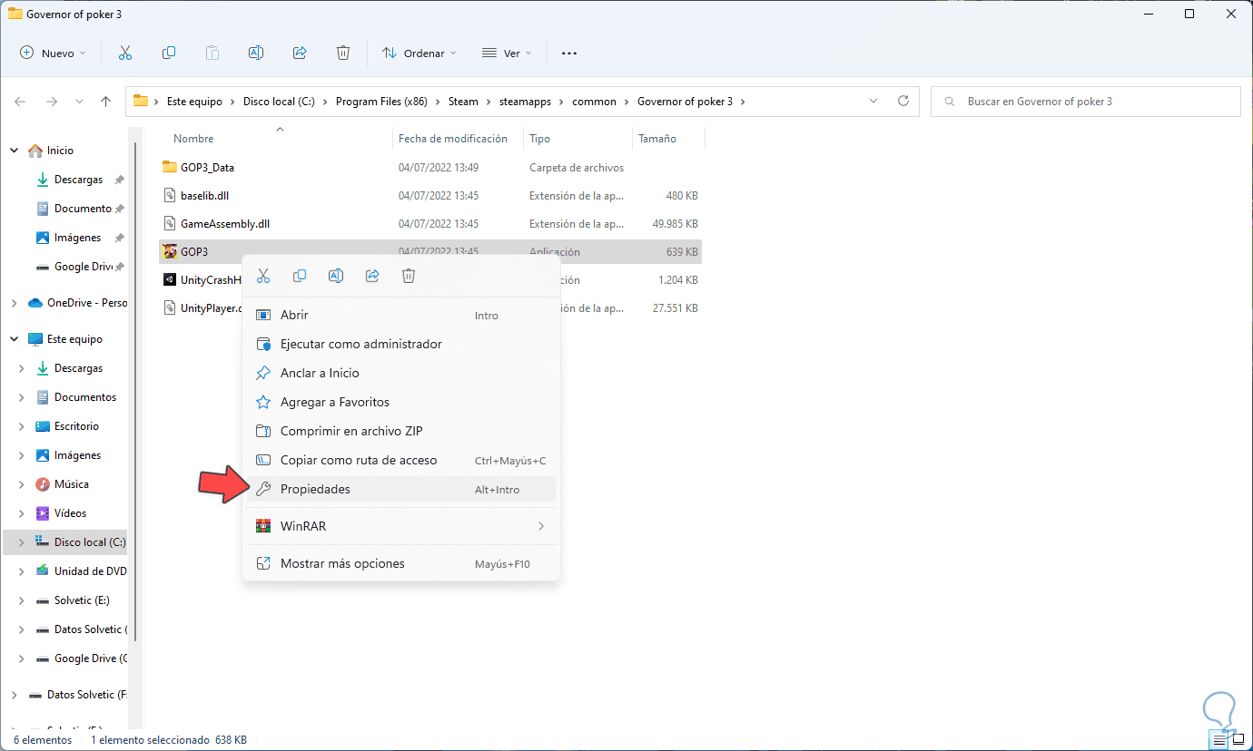 Esto abrirá la carpeta en el Explorador de archivos, allí damos clic derecho sobre el ejecutable y seleccionamos "Propiedades":