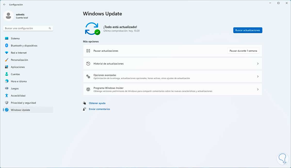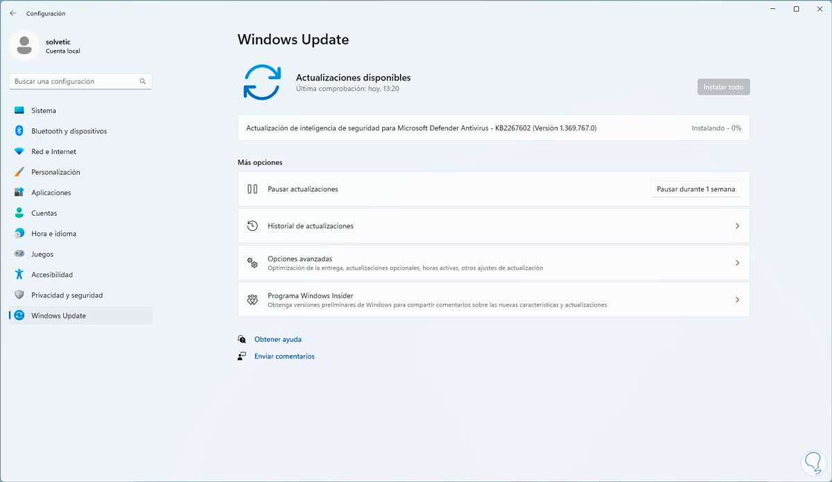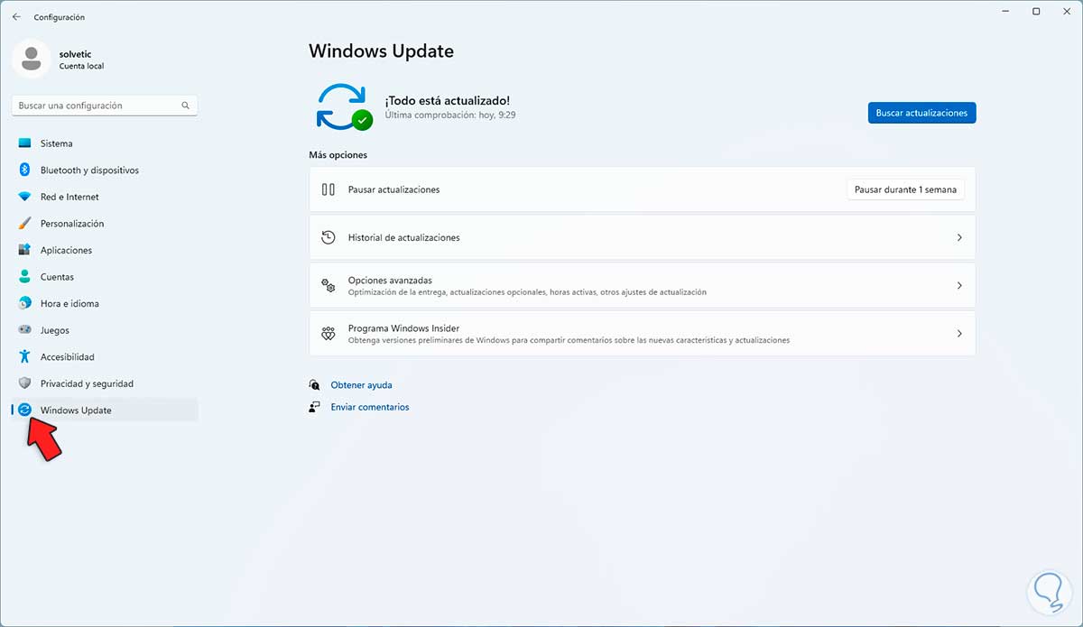 En este caso lo primero a revisar será el disponer de actualizaciones para el sistema, vamos a "Inicio - Configuración - Windows Update":