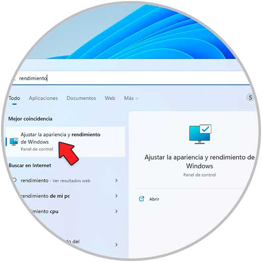 Para ajustar esta memoria virtual en el buscador de Inicio ingresamos "rendimiento":
