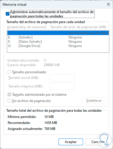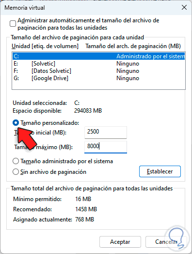 Desactivamos la casilla "Administrar automáticamente el tamaño del archivo de paginación para todas las unidades", activamos la casilla "Tamaño personalizado" e ingresamos el tamaño deseado de la memoria virtual: