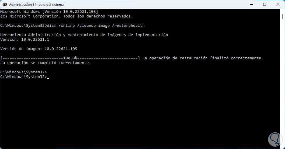 Ejecutamos el siguiente comando para restaurar la integridad de la imagen de Windows: