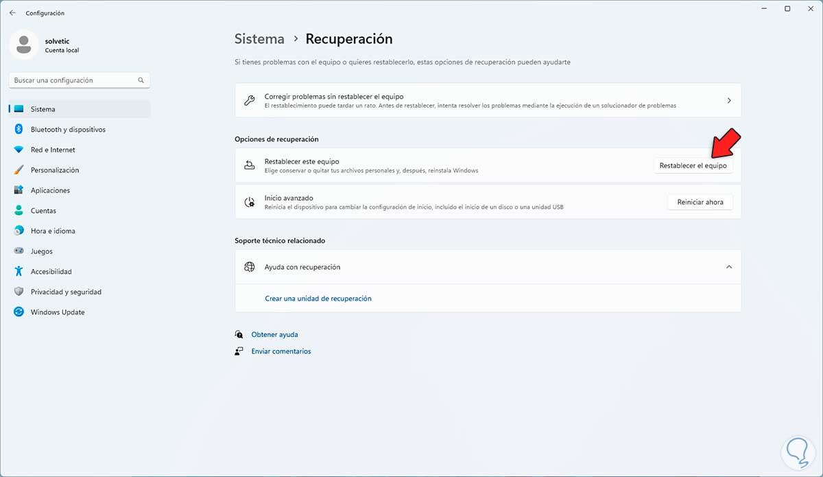 Vamos a "Inicio - Configuración - Sistema - Recuperación":