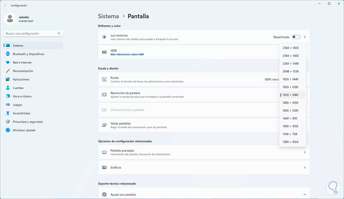 En "Resolución de pantalla" seleccionamos alguna de las opciones disponibles: