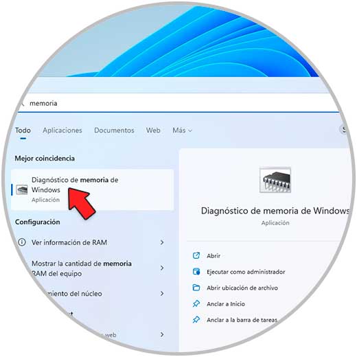 Para usarla en el buscador de Inicio ingresamos "memoria" y luego damos clic en "Diagnóstico de memoria de Windows":