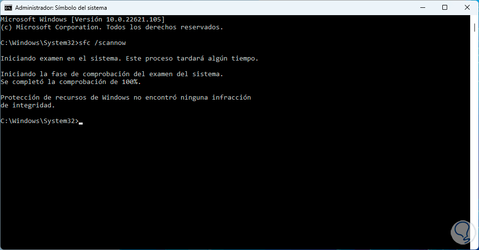 SFC (System File Checker) se encarga de analizar el sistema de archivos NTFS para detectar errores y corregirlos, esperamos que se complete la operación: