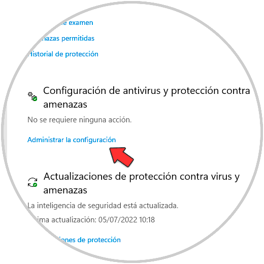 En "Protección antivirus y contra amenazas" damos clic en "Administrar la configuración":