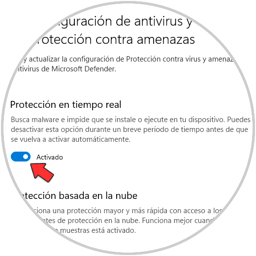Validamos que el interruptor "Protección en tiempo real" este activo: