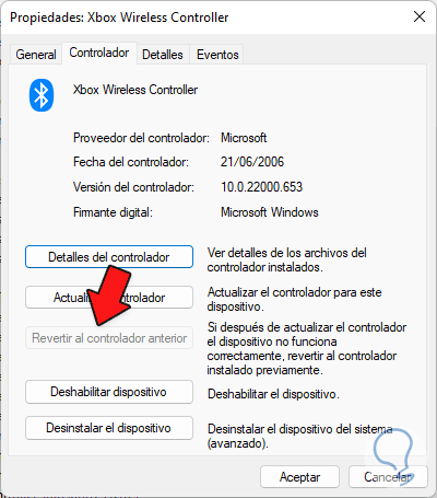 Entramos en la opción de “Controlador” y elegiremos “Revertir al controlador anterior” si está disponible: