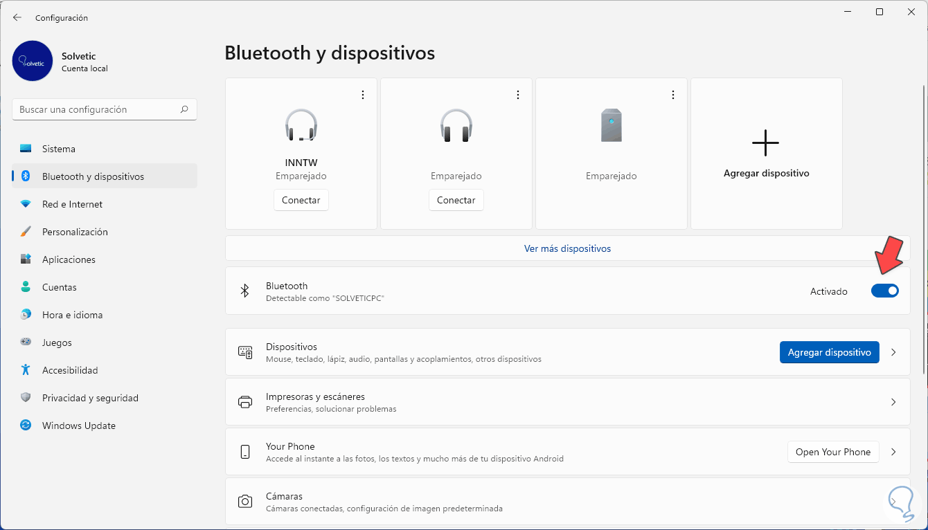 Aquí pulsaremos sobre el interruptor de “Bluetooth” para activarlo: