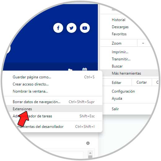 En este caso podemos deshabilitar las extensiones para detectar si es la causa del error. Abrimos Chrome y vamos a "Personalizar y controlar Google Chrome - Mas herramientas - Extensiones":