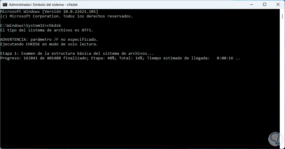 Ejecutamos "chkdsk" y el comando se ejecutará sin problemas: