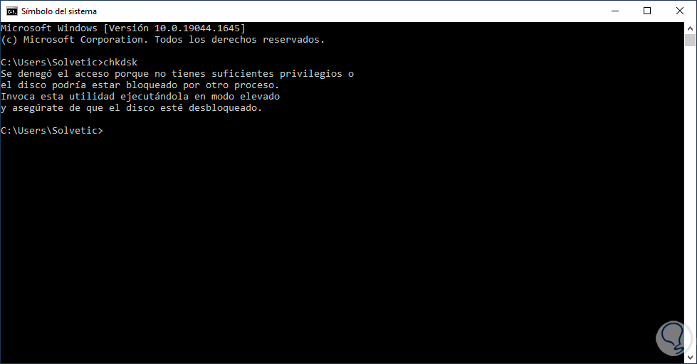 Ejecutamos "chkdsk" y observaremos un error de permisos para correr este comando: