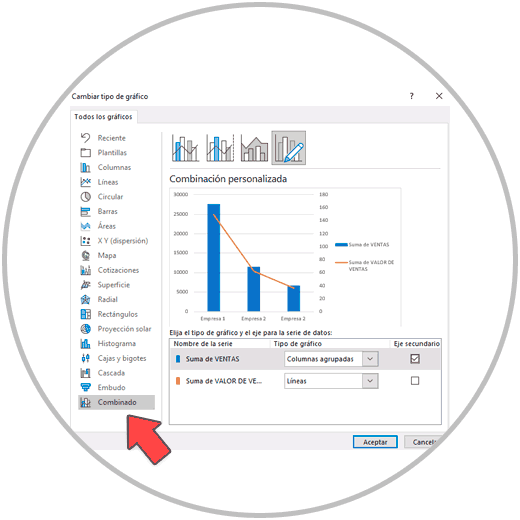 Ahora seleccionamos el tipo de gráfico combinado como vemos en la imagen de abajo, y seleccionamos uno de los dos ejes como eje secundario.