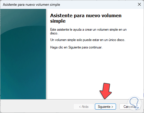 Damos clic en Siguiente para definir el espacio a usar del disco: