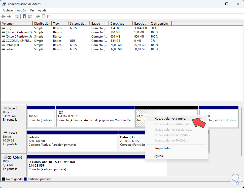 Allí validamos el disco o partición con la leyenda "No asignado", es decir, este es el disco o partición no visible que por un error de configuración no está activo, para corregirlo, damos clic derecho sobre esta unidad y elegimos la opción "Nuevo volumen simple":