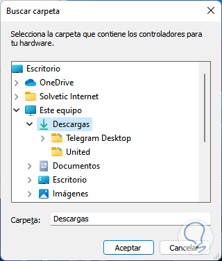 Damos clic en "Examinar" y seleccionamos la carpeta donde se guardó el ejecutable o carpeta del controlador: